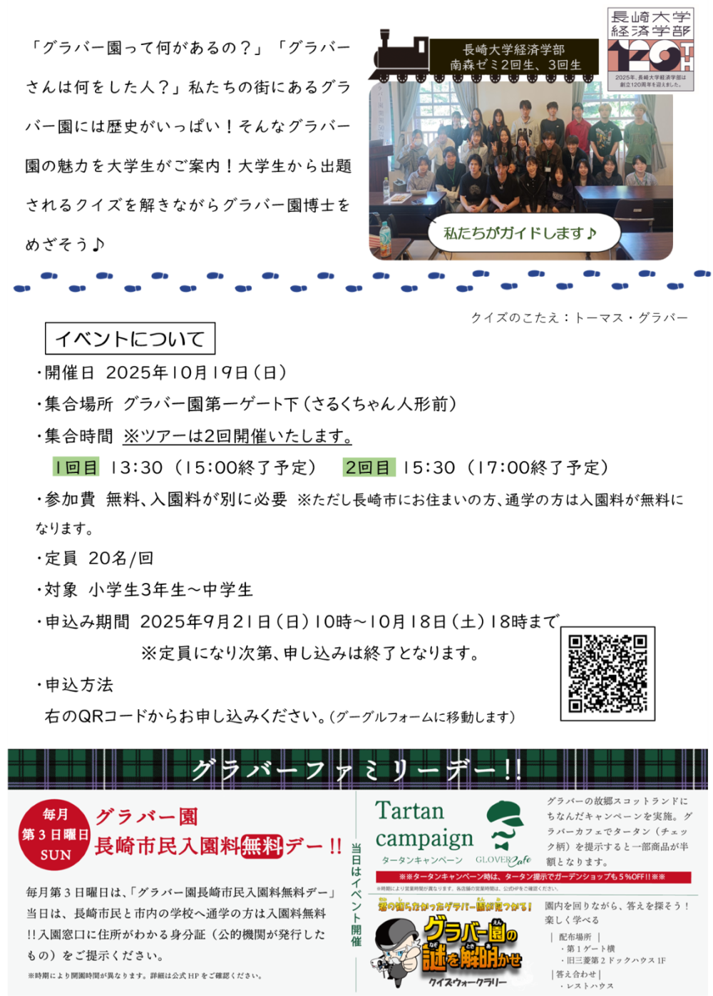 「グラバー園って何があるの?」「グラバーさんは何をした人?」私たちの街にあるグラバー園には歴史がいっぱい!そんなグラバー園の魅力を大学生がご案内!大学生から出題されるクイズを解きながらグラバー園博士をめざそう♪