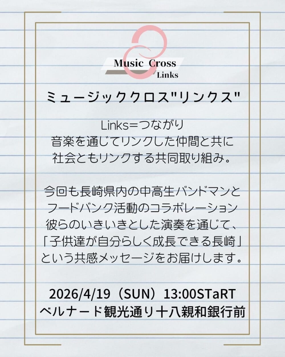音楽を通じて人と人、そして社会をつなぐ特別なステージイベントを行います。長崎県内の中高生バンドマンたちが集まり、演奏をお届けします♪
